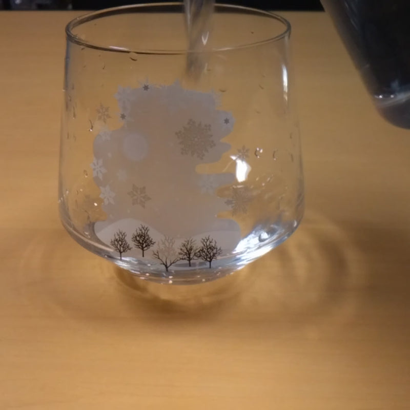 グラスに冷たい飲み物を注ぐと鮮やかな雪景色が浮かび上がります。